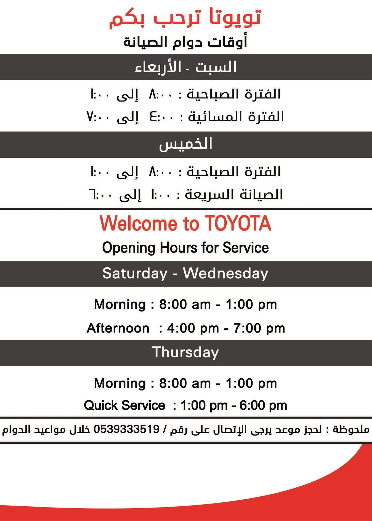 مواعيد عمل صيانة تويوتا. صيانة تويوتا السعودية on twitter ضيوفنا الكرام يشرفنا خدمتكم من الساعة ٧ ٠٠ صباحا حتى الساعة ٢ ٠٠ مساء في منطقة مكة المكرمة ومن الساعة ٨ ٠٠ صباحا حتى الساعة ٦ ٣٠ مساء في جميع مناطق